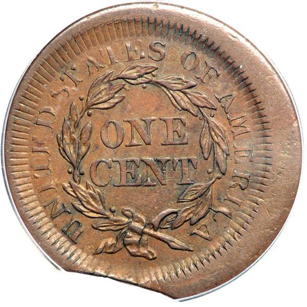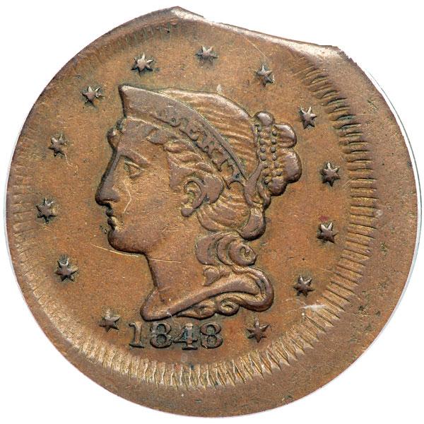1848 Small Date Fantasy Cent Rarity-7-. PCGS graded AU-53. Slightly sharper with a few faint hairline scratches on the cheek, a light pinscratch high on the neck into the field close under the chin, and a disjointed one on the reverse from the dentils right of the second S in STATES down through the wreath and right side of the N in ONE to between the E & N in CENT. Only the scratch under the chin is visible to the unaided eye. Rather glossy medium brown with chocolate brown toning in protected areas. A large curved planchet clip reaches to near the base of the dentils from left of star 7 to right of star 8 and the opposing ones under the wreath ribbon. The planchet is slightly oversize at 30.0 millimeters and weighs a hefty 176.8 grains. Struck slightly off center to K-10. There is no trace of undertype or of multiple strikes. Our grade is net VF30, second finest of the 10-13 examples known of this extremely rare and popular privately struck "cent." Only 10 of those examples have been confirmed, and only two of those grade higher than F12 in the Noyes and Grellman census lists. The finest known piece, which is only marginally finer than this coin, was a PCGS graded AU55 (our grade net VF35) that we sold as lot #900 in our auction of the Ted Naftzger late date large cents on 7 September 2009. Howard Newcomb devoted a couple pages in his book on the series to the "Small Date" 1848 cent, and most of the top collections have contained at least one piece. The spectacular Holmes collection contains three examples, each with its own unique attributes. This one comes with a nice provenance, and its pedigree to the Dan Holmes Collection is noted on the PCGS label. PCGS population 1; 1 in AU55 for the variety at PCGS. DWH #2484 (PCGS # 403850) .