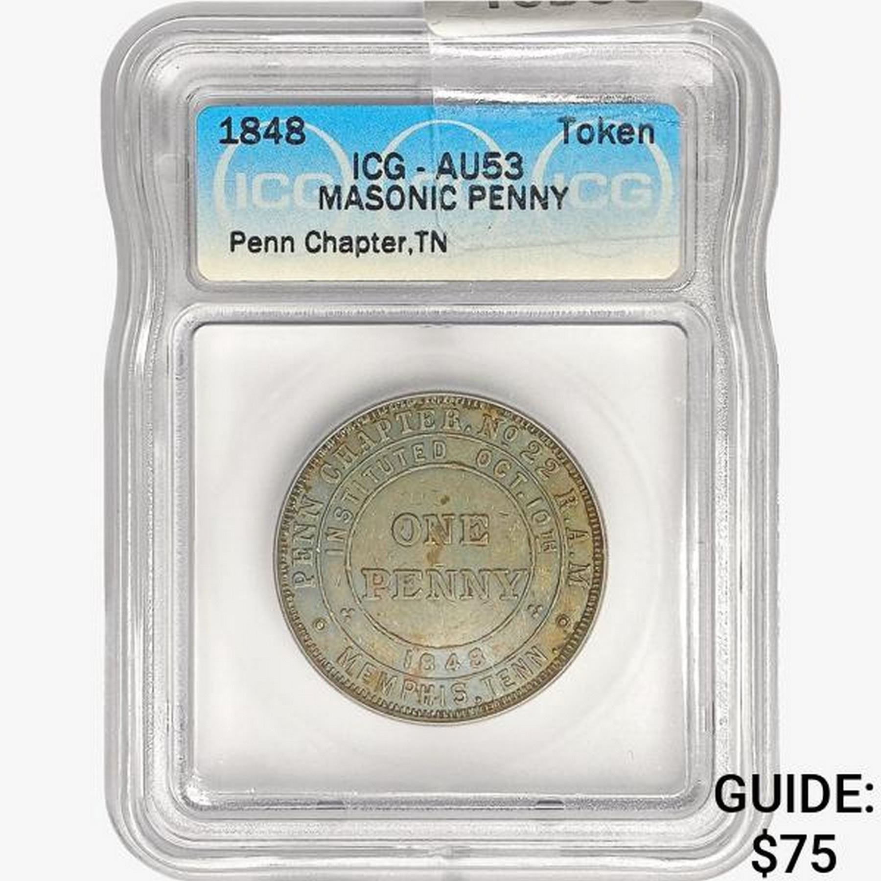 1848 TN Token Penn Chapter ICG AU53 Masonic Penny