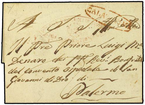 1848 Wrapper to Palermo bearing red oval Calatafimi + "Poste E Procacci In Sicilia * Servizio Nazionale" with trinacria emblem in centre, maritime handstamp used solely during revolutionary period 1848-49.