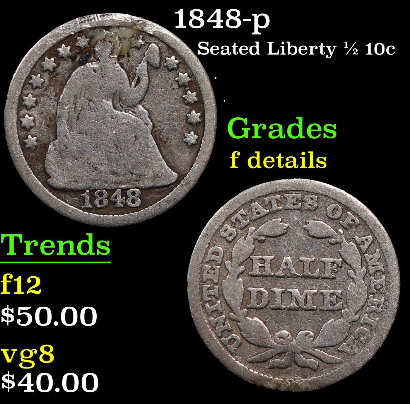 1848-p Seated Liberty Half Dime 1/2 10c Grades f details.
