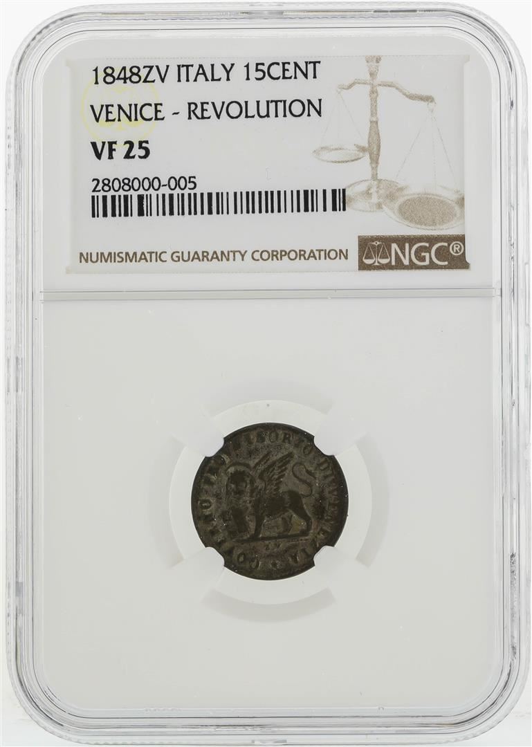 One 1848ZV Italy 15 Centesimi Venice Revolution Coin NGC VF25. NGC Certified.