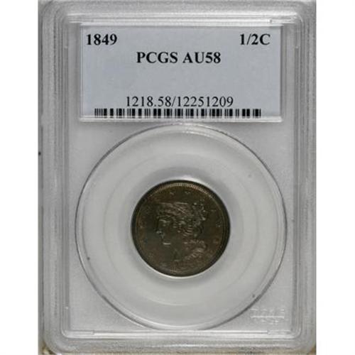 <B>1849 1/2 C Large Date AU58 PCGS.</B></I> PCGS Population (26/86). NGC Census: (18/129). Mintage: 39,864. Numismedia Wsl. Price for NGC/PCGS coin in AU58: $246. (#1218)<BR><BR><B>Coin Engraver:</B> Christian Gobrecht<BR><BR><b>Shipping:</b> Coins & Currency (<a target="_blank" href="http://www.heritageauctions.com/common/shipping.php">view shipping information</a>)