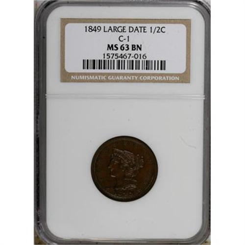 <B>1849 1/2 C Large Date MS63 Brown NGC.</B></I> C-1. NGC Census: (30/42). PCGS Population (29/20). Mintage: 39,864. Numismedia Wsl. Price for NGC/PCGS coin in MS63: $450. (#1218)<BR><BR><B>Coin Engraver:</B> Christian Gobrecht<BR><BR><b>Shipping:</b> Coins & Currency (<a target="_blank" href="http://www.heritageauctions.com/common/shipping.php">view shipping information</a>)