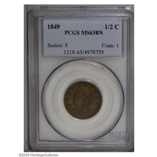 1849 1/2 C Large Date MS63 Brown PCGS. B-4, C-1, R.2. 1849[1/2 C] Large Date MS63 Brown PCGS.