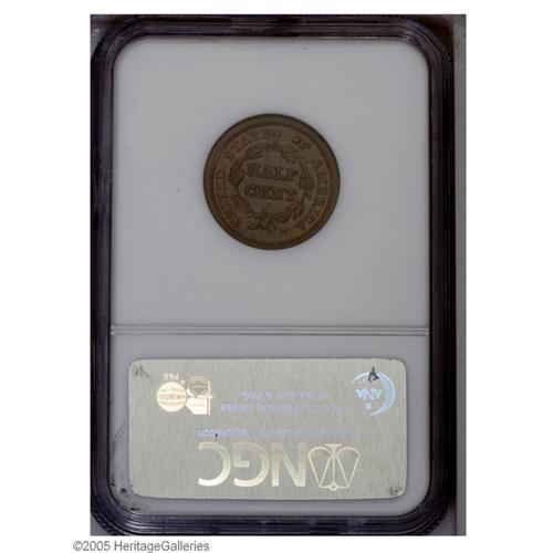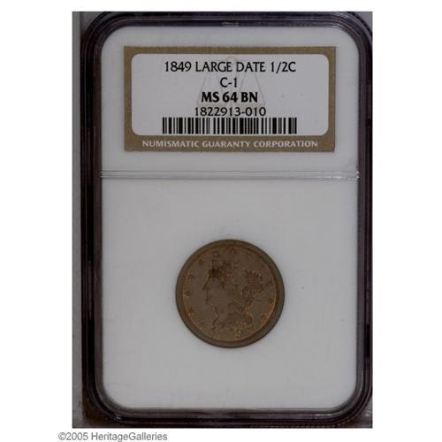 <B>1849<1/2 C> Large Date MS64 Brown NGC.</B></I> B-4, C-1, R.2. The first business strike Half Cent of the Coronet design, this is a tan-brown example with some secluded red highlights in the protected areas. The strike is above average for the issue and there are neither carbon spots nor distracting abrasions on either side.