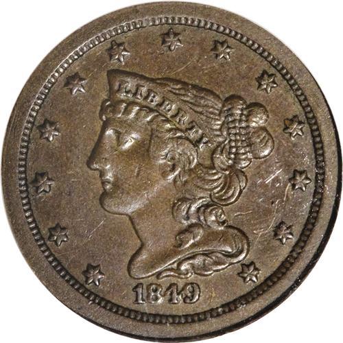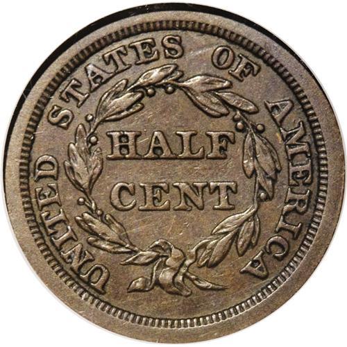 <B>1849 1/2 C Small Date PR45 NGC.</B></I> Large Berries. Breen-1, Low R.7. The production of half cents for circulation resumed in 1849, after a 14-year hiatus. But those piece bore Large Dates. The 1849 Small Date is a proof-only issue that comes in two varieties: Originals, with large berries within the wreath, and First Restrikes, with small berries in the wreath. Although struck as a proof, the present medium brown Original example eventually briefly entered commerce, where it received light wear along with a few thin obverse handling marks. NGC has certified only five Original proofs of this date (4/07).<BR><BR><b>Shipping:</b> Coins & Currency (<a target="_blank" href="http://www.heritageauctions.com/common/shipping.php">view shipping information</a>)