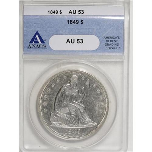 <B>1849 $1 AU53 ANACS.</B></I> NGC Census: (14/139). PCGS Population (28/118). Mintage: 62,600. Numismedia Wsl. Price for NGC/PCGS coin in AU53: $675. (#6936)<BR><BR><B>Coin Engraver:</B> Christian Gobrecht<BR><BR><b>Shipping:</b> Coins & Currency (<a target="_blank" href="http://www.heritageauctions.com/common/shipping.php">view shipping information</a>)