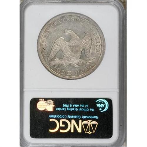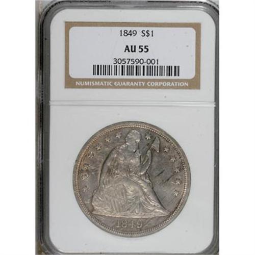 <B>1849 $1 AU55 NGC.</B></I> This is an early die state example, with die lines resembling whiskers beneath Liberty's chin. The design motifs are generally bold, with typical weakness observed on some of the obverse stars. Several grease streaks (as made) reside on the obverse, but do not affect the technical grade of this Choice AU dollar. <BR><BR><B>Coin Engraver:</B> Christian Gobrecht<BR><BR><b>Shipping:</b> Coins & Currency (<a target="_blank" href="http://www.heritageauctions.com/common/shipping.php">view shipping information</a>)