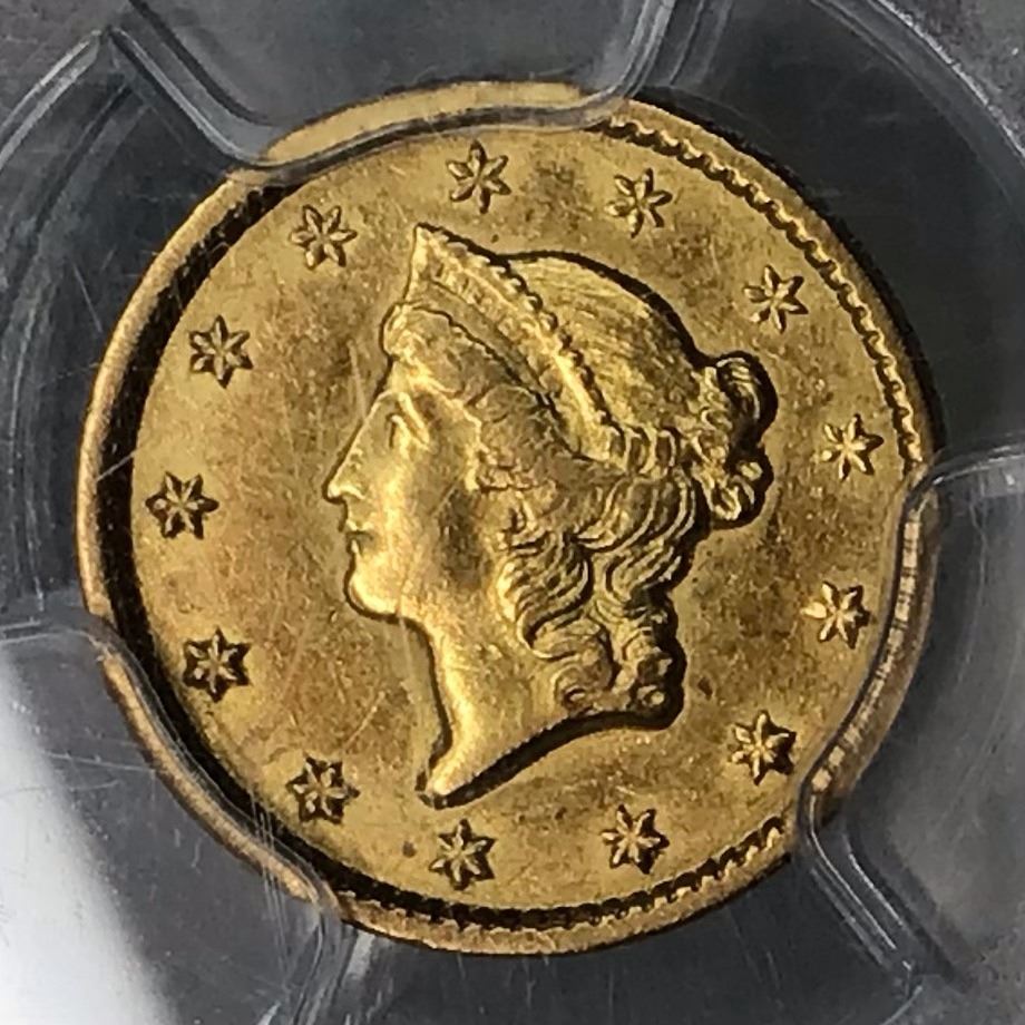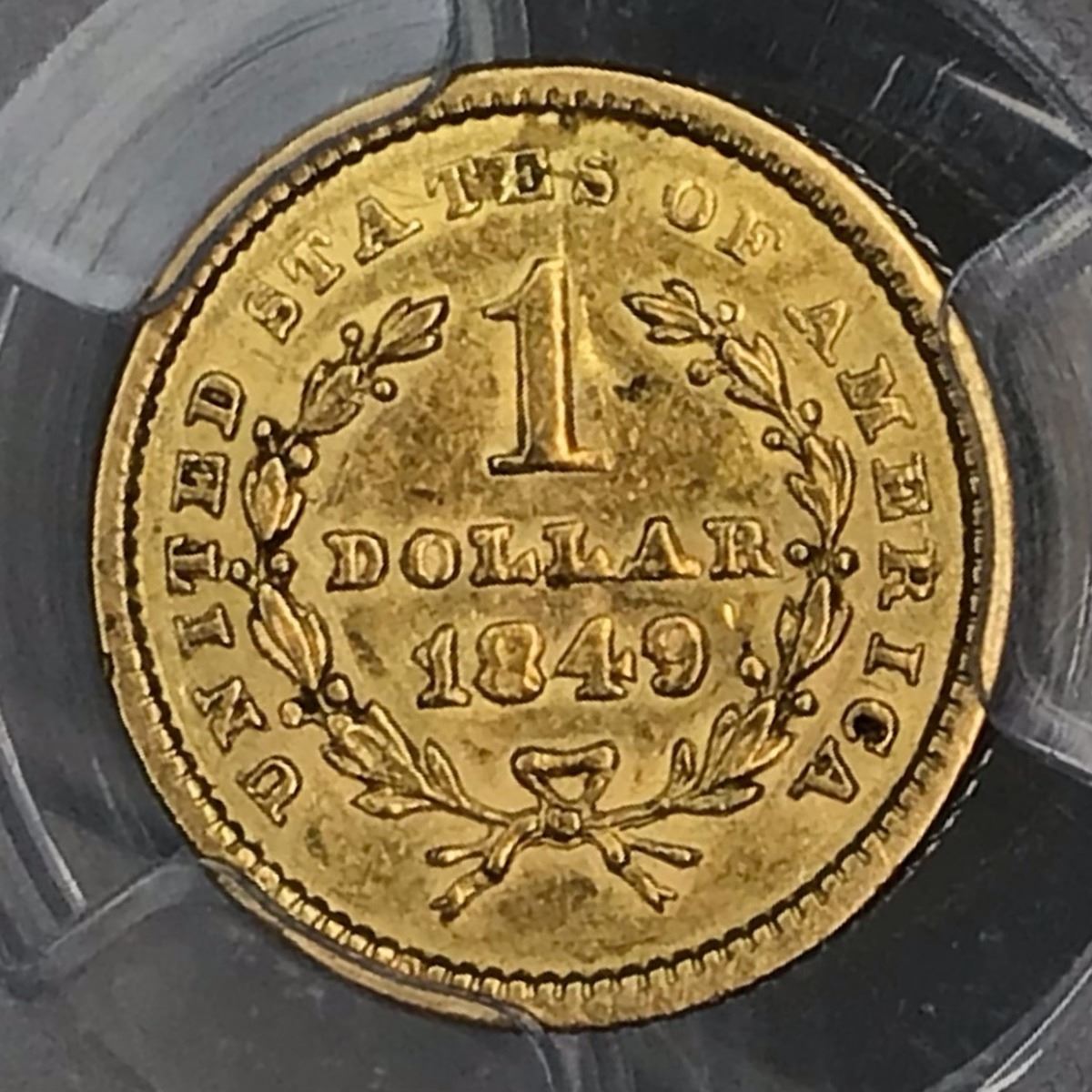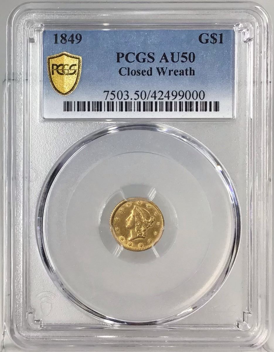 One 1849 $1 Closed Wreath Gold Coin PCGS AU50.