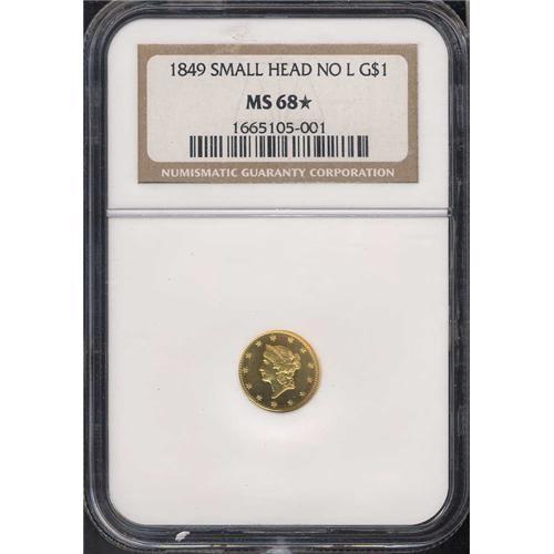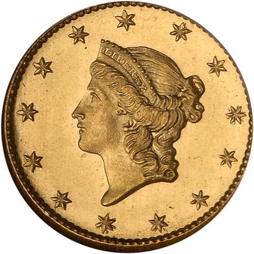 From an unknown mintage, but Breen and Akers both estimate 1000, which seems high based on the numbers of survivors. Smaller Head with No L for the engraver Longacre at the neck. A fully struck proof-like Cameo Superb Gem example of the type. FINEST KNOWN of the three certified in this grade. There is a certified proof of this date but this is the finer of the two coins both technically and from the point of view of eye appeal. This very coin sold for $31,000 in 1998.
