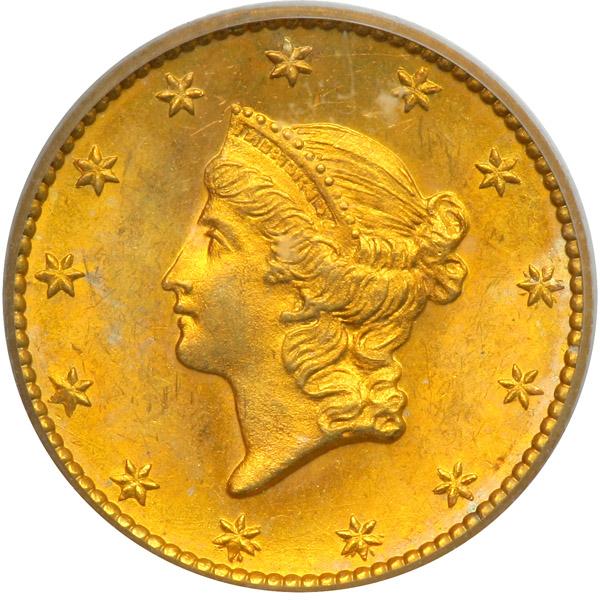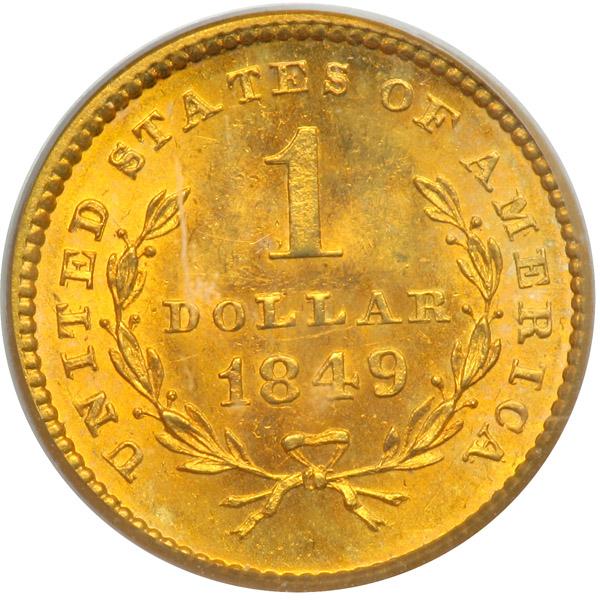1849. Open wreath. PCGS graded MS-65 PQ. A lustrous first year of issue gem, sparkling with frosty mint luster and natural reddish golden color. A Premium Quality example for the grade. Pop 50; 15 finer (PCGS # 7502) .