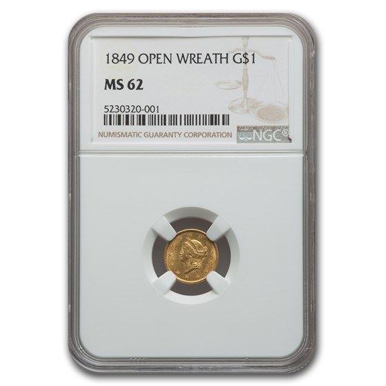 One piece 1849 $1 Liberty Head Gold Open Wreath MS-62 NGC