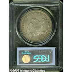 <B>1849<img border='0' src='http://www.heritagecoins.com/images/star.gif' width=10 height=10>$1 MS62 PCGS.</B></I> A scarce item in mint condition, very few were saved out of the mintage of 62,600 pieces. This specimen has a mix of pastel cobalt-blue, rose, magenta, and gray patina over semi-lustrous surfaces. The design elements are well struck, and a few minor marks are seen on Liberty's cheek and chest, and on the upper part of the shields on both sides.