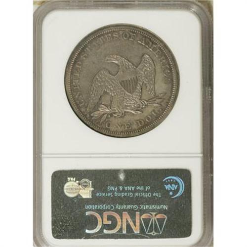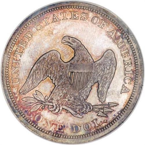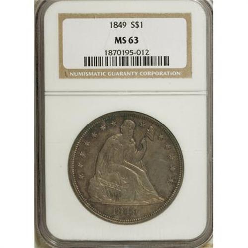 <B>1849 $1 MS63 NGC.</B></I> The 1849, from a mintage of 62,600 pieces, is rare in Mint State. This Select example features golden-gray patination splashed with sky-blue and lavender. An attentive strike leaves good definition on the motifs, except for the usually seen softness on the eagle's neck feathers. A few trivial marks preclude a finer grade. Census: 14 in 63, 6 finer (2/08).<BR><I>From The Queller Family Collection of Silver Dollars.</B></I><BR><BR><B>Coin Engraver:</B> Christian Gobrecht<BR><BR><b>Shipping:</b> Coins & Currency (<a target="_blank" href="http://www.heritageauctions.com/common/shipping.php">view shipping information</a>)