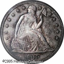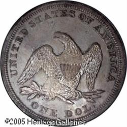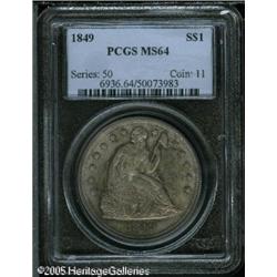 <B>1849<img border='0' src='http://www.heritagecoins.com/images/star.gif' width=10 height=10>$1 MS64 PCGS.</B></I> Luminous peach, electric-blue, and mauve-violet colors enrich the obverse, while the reverse features tan and dove-gray patina. This satiny, originally toned near-Gem is carefully preserved. Not fully struck, but the eye appeal is irrefutable. The dies are rotated counterclockwise approximately 10 degrees. Only 62,600 pieces were struck. Population: 6 in 64, 2 finer (1/05). Lot:7368