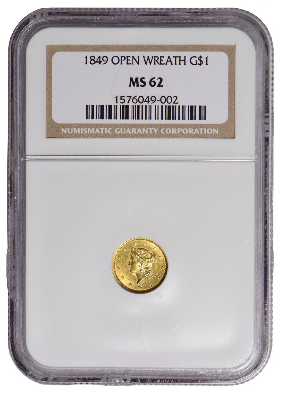 One 1849 $1 Open Wreath Gold Coin NGC MS62.