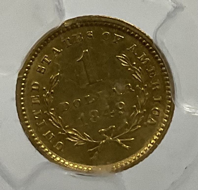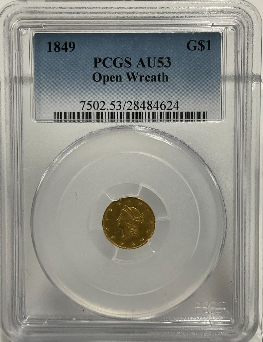 One 1849 $1 Open Wreath Gold Coin PCGS AU53.