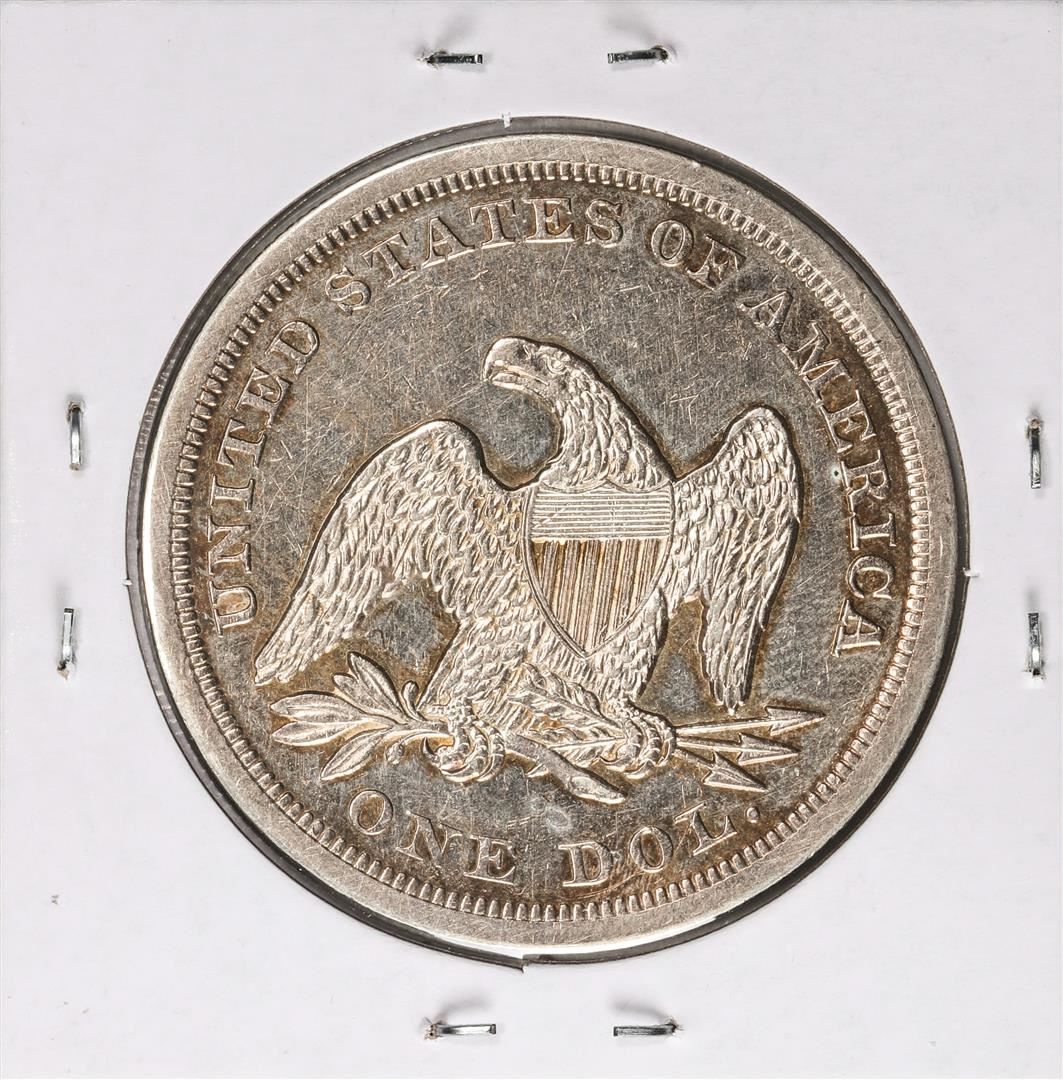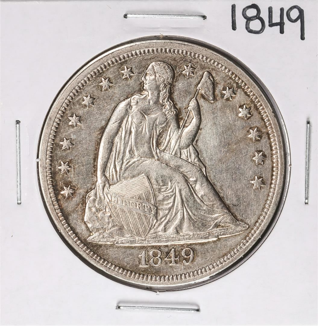 One 1849 $1 Seated Liberty Silver Dollar Coin.