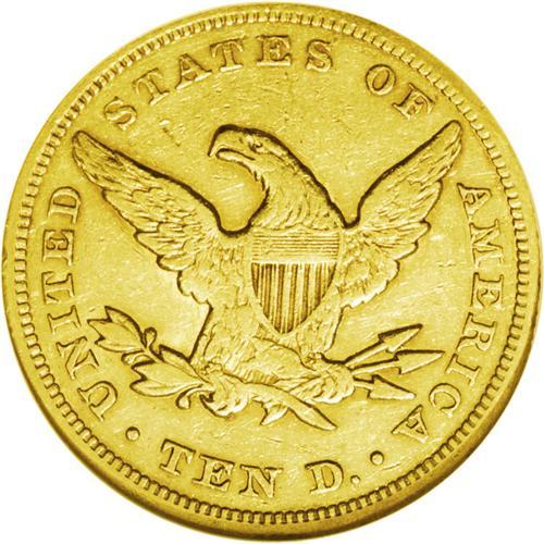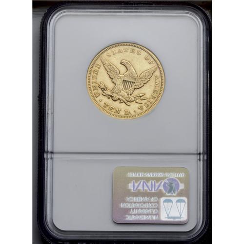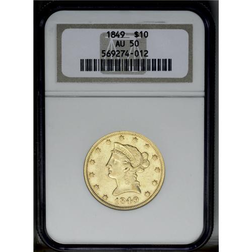 <B>1849<$10> AU50 NGC.</B></I> Breen-6888. Walter Breen described this variety as an 1849/1848 overdate with repunching visible on all but the digit 1, each original digit about 25% below the final position. Speculation remains about the true nature of this repunching, with some students suggesting that it is not an actual overdate but merely a repunched date. Either way, it is certainly dramatic and undoubtedly quite rare. A diagnostic die crack runs through the crossbar of the 4, from the border to the bust truncation, continuing vertical through the neck to the lovelock. Lightly worn with hints of original luster on the mustard-orange surfaces and assorted handling marks.<BR><I>From The Clifton Rodenburg Collection.</B></I>