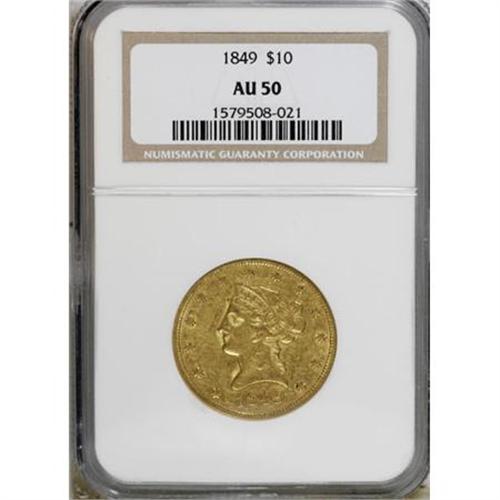 <B>1849 $10 AU50 NGC.</B></I> NGC Census: (90/339). PCGS Population (47/109). Mintage: 653,618. Numismedia Wsl. Price for NGC/PCGS coin in AU50: $432. (#8601)<BR><BR><B>Coin Engraver:</B> Christian Gobrecht<BR><BR><b>Shipping:</b> Coins & Currency (<a target="_blank" href="http://www.heritageauctions.com/common/shipping.php">view shipping information</a>)
