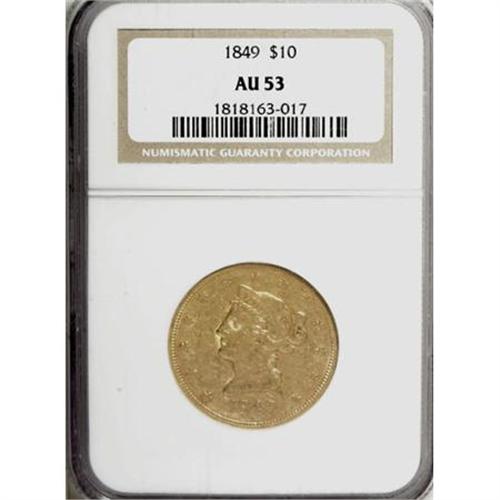 <B>1849 $10 AU53 NGC.</B></I> NGC Census: (84/255). PCGS Population (25/84). Mintage: 653,618. Numismedia Wsl. Price for NGC/PCGS coin in AU53: $500. (#8601)<BR><BR><B>Coin Engraver:</B> Christian Gobrecht<BR><BR><b>Shipping:</b> Coins & Currency (<a target="_blank" href="http://www.heritageauctions.com/common/shipping.php">view shipping information</a>)