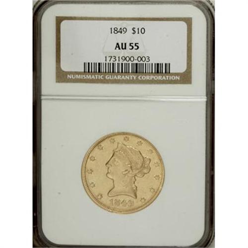 <B>1849 $10 AU55 NGC.</B></I> This No Motto type coin has ample luster and consistent yellow-gold color. Typically struck, and the only mentionable mark is a small rim nick on the obverse at 6:30.<BR><BR><B>Coin Engraver:</B> Christian Gobrecht<BR><BR><b>Shipping:</b> Coins & Currency (<a target="_blank" href="http://www.heritageauctions.com/common/shipping.php">view shipping information</a>)