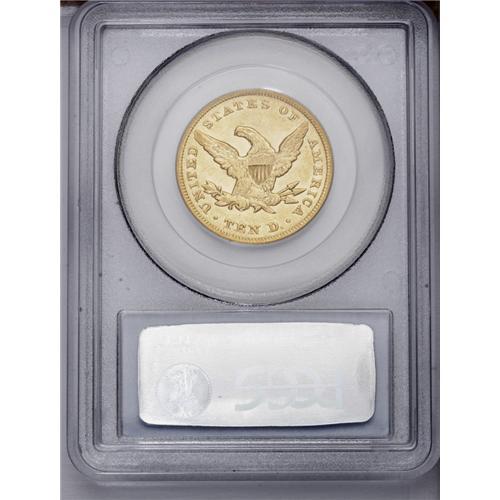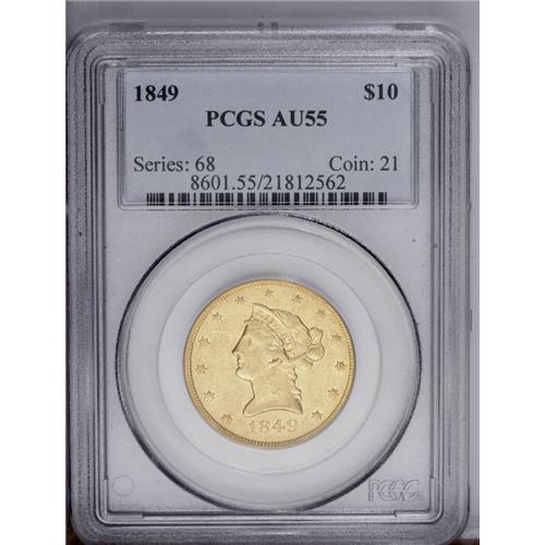 <B>1849 $10 AU55 PCGS.</B></I> Although the lovelock beneath the ear is typically impressed, this No Motto ten is attractive due to the ample remaining luster and the relative absence of detrimental marks. Only a horizontal blemish between stars 4 and 5 merits even passing mention.