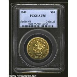 1849 $10 AU55 PCGS. The 1 in the date is boldly repunched, with the base of a previous 1 across the lower upright. Well struck except for the lower obverse stars. The abundant remaining luster is somewhat prooflike, especially on the obverse. A few trivial contact marks are noted in the upper reverse field. Important notice: We expect to be auctioning lots at the rate of 200-250 per hour. Sometimes eBay Premier live bid software cannot keep up with that pace, so we strongly recommend that you place a realistic proxy bid now as insurance to avoid disappointment. Also please note that all Heritage/CAA lots purchased through eBay Premier carry a 20% Buyer's Premium. Please make sure you read the Terms and Conditions.