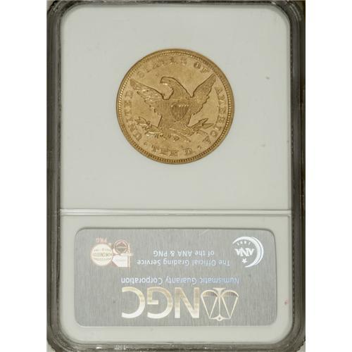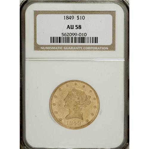 <B>1849 $10 AU58 NGC.</B></I> Breen-6887. The tine that protrudes from the left side of the 9 is a remnant from an earlier misplaced date. Well struck and softly lustrous with hints of green in the lightly abraded, semi-prooflike fields.<BR><BR><b>Shipping:</b> Coins & Currency (<a target="_blank" href="http://www.heritageauctions.com/common/shipping.php">view shipping information</a>)