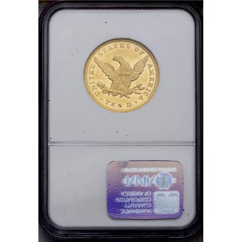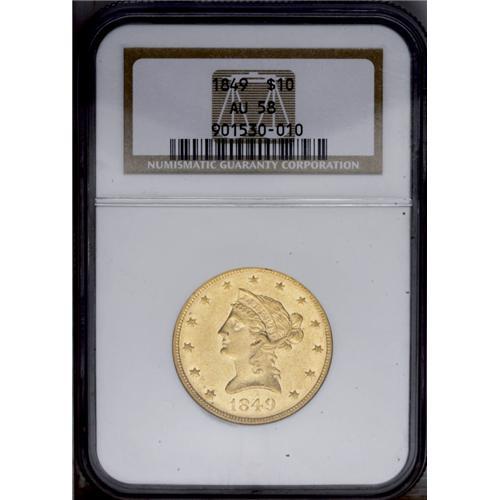 <B>1849<$10> AU58 NGC.</B></I> Bright peach-gold surfaces display considerable luster in the recessed areas. Except for softness in the star centers and on the hair curl at the ear, the design elements are well defined. Tiny contact marks are evenly distributed over both sides.