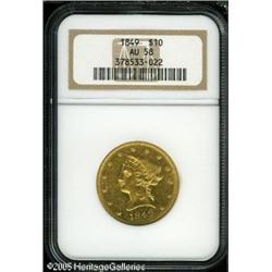 <B>1849 $10 AU58 NGC.</B></I> Not fully struck, but extensive semi-prooflike luster is present and the portrait is particularly devoid of unpleasant marks. Conditionally scarce at the Borderline Uncirculated level. Lot:8739