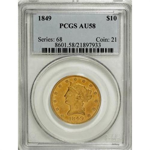 <B>1849 $10 AU58 PCGS.</B></I> An attractive and crisply struck apricot-gold representative with ample remaining luster. The fields display only minor marks when viewed beneath a loupe. Population: 18 in 58, 35 finer (7/07).<BR><BR><B>Coin Engraver:</B> Christian Gobrecht<BR><BR><b>Shipping:</b> Coins & Currency (<a target="_blank" href="http://www.heritageauctions.com/common/shipping.php">view shipping information</a>)