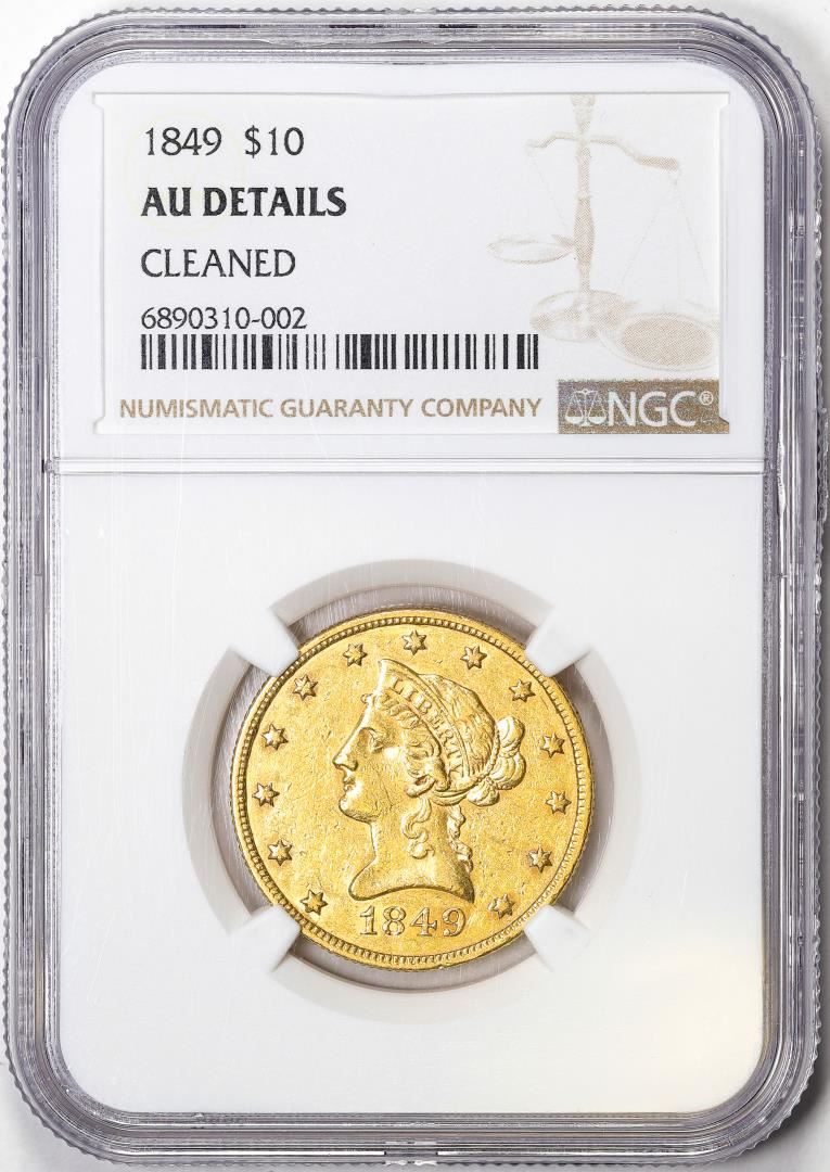 One 1849 $10 Liberty Head Eagle Gold Coin NGC AU Details Cleaned. NGC Certified.
