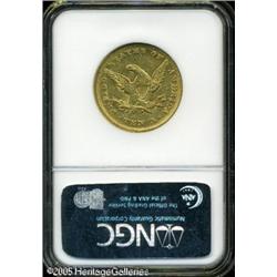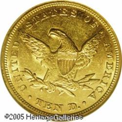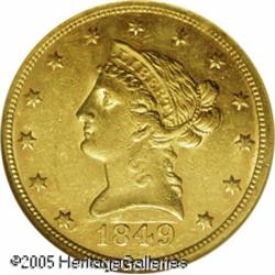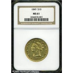 <B>1849 $10 MS61 NGC.</B></I> Scarce in Mint State and this coin retains most of the original luster in the protected areas. The strike is typically weak, with softness on the upper curls of Liberty and on the eagle. The surfaces show scattered handling ticks and a few minor scratches, including one diagonally through some of the horizontal shield lines, and another between CA of AMERICA. Population: 10 in 61, 26 finer (1/05). Lot:8740
