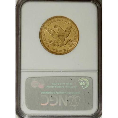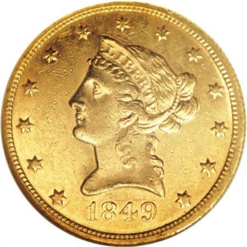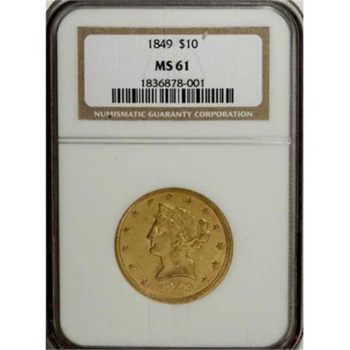 <B>1849 $10 MS61 NGC.</B></I> All No Motto eagles are rare in Mint State, including the 1849. The strike is typical on Liberty's curls and the left shield border, but the extent of bright luster is satisfactory for the grade, and field marks are individually minor save for a horizontal pinscratch above the date. Census: 14 in 61, 29 finer (8/07).<BR><BR><B>Coin Engraver:</B> Christian Gobrecht<BR><BR><b>Shipping:</b> Coins & Currency (<a target="_blank" href="http://www.heritageauctions.com/common/shipping.php">view shipping information</a>)