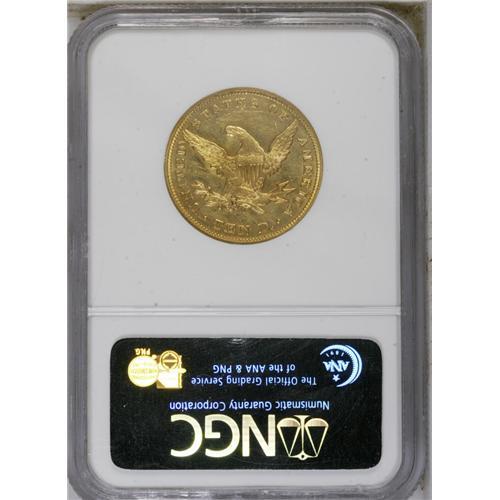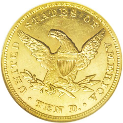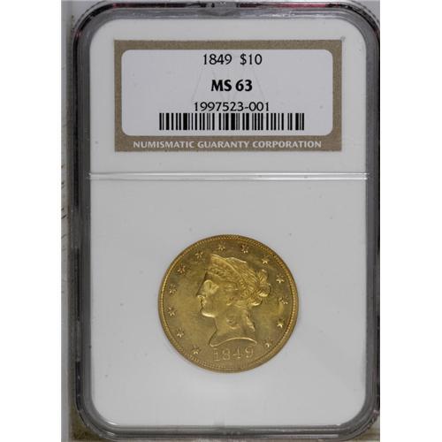 <B>1849<$10> MS63 NGC.</B></I> Although the present No Motto eagle is undesignated as Prooflike by NGC, both fields are nonetheless flashy. The reverse field is particularly reflective. The 1849 is readily collectible in XF and AU grades, but Mint State examples are rare, and none have been certified above MS64. A prooflike MS63 example provides an important opportunity for the gold specialist. Evaluation using a loupe reveals no identifying marks, and only a cluster of light hairlines on the upper reverse field limits the grade. Moderate strike incompleteness is noted on the centers of the major devices. This die variety is interesting for a cluster of bold die lines through the TY in LIBERTY, and a second set of mint-made die lines through Liberty's curls. Population: 8 in 63, 3 finer (9/06).