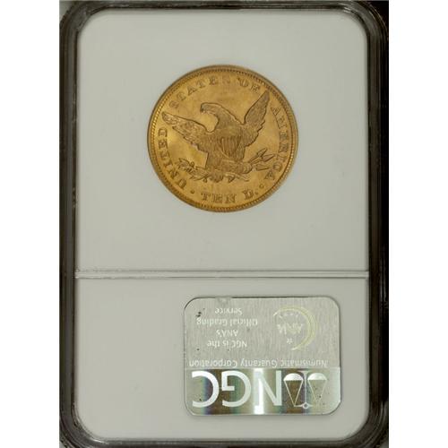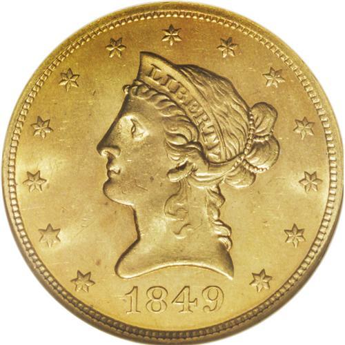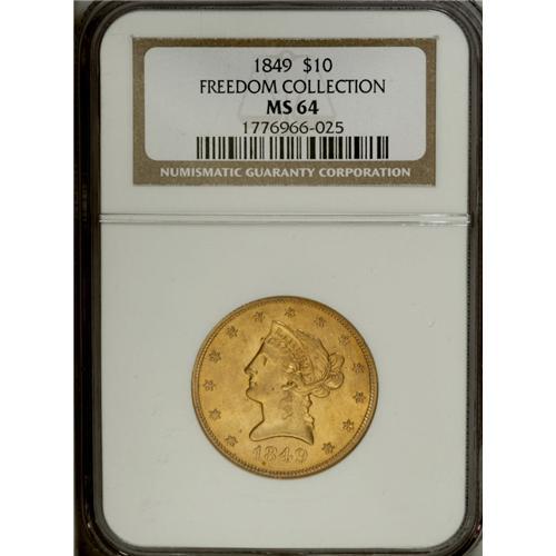 <B>1849 $10 MS64 NGC.</B></I> Although No Motto Liberty eagles are relatively plentiful in XF grades, pieces with full mint luster are seldom seen. On those extraordinary occasions when a completely lustrous No Motto eagle appears at auction, it is often abraded or an indifferent strike. Here is an impressive piece that has both booming luster and unmarked surfaces. In addition, the strike is above average, since only star 2 is soft. Rich orange-gold toning contributes further to the eye appeal. A minor L-shaped lintmark above the jaw serves to identify this exceptional gold type coin. Census: 6 in 64, 0 finer (10/06).<BR><I>From The Freedom Collection.</B></I><BR><BR><b>Shipping:</b> Coin/Currency (<a target="_blank" href="http://www.heritageauctions.com/common/shipping.php">view shipping information</a>)