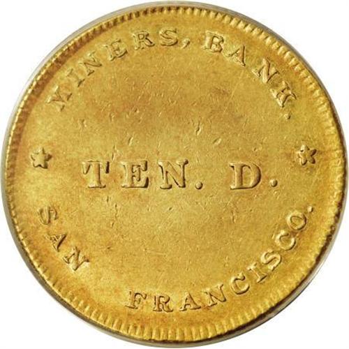 <B>(1849) $10 Miners' Bank Ten Dollar AU55 PCGS.</B></I> K-1, R.6. Plain or normal border, raised rim. The Miners' Bank was an early gold rush San Francisco business. The firm issued one, three, and five dollar notes on March 1, 1849, and later issued undated fractional denominations. Ten dollar gold pieces were struck prior to August 9, 1849, since the firm's president and cashier, Stephen A. Wright and Samuel Haight, unsuccessfully petitioned the customs collectors on that date to accept their coins. The New Orleans Mint assayed examples of the ten dollar coins on October 16 of that year. The firm was dissolved on January 14, 1850.<BR> Along with other 1849 private gold coiners, with the exception of Moffat & Co., the Miners' Bank coins were discredited by local assays. An April 11, 1850 report in the Alta California newspaper noted: "Brokers refuse to touch it at less than 20 percent discount." Most were eventually melted by bankers and other arbitragers, often with their alloy converted to U.S. Assay Office "slugs."<BR> Two different varieties were produced. Specialists believe the orange-gold (copper alloy) pieces (Kagin 1) were die trials produced in the east, while the green-gold (silver alloy) pieces (Kagin 2) were struck in native California gold. Donald Kagin suggests the Kagin-1 coins were struck with a collar, after which the obverse and reverse dies were transported to California, where the Kagin-2 coins were struck without a collar.<BR> The present piece is well struck and exhibits considerable bright luster. No marks are consequential. An identifier is provided by a mint-produced lintmark on each side of the left (facing) wing near the wingtip. The number of territorial gold type collectors vastly exceeds the number of surviving Miner's Bank gold pieces. Listed on page 357 of the 2008 <I>Guide Book</B></I>. Population: 4 in 55, 5 finer (11/07).<I><BR>Ex: American Numismatic Rarities, 8/06, lot 1127, which realized $63,250.<BR>From The Madison Collection.</B></I><BR><BR><b>Shipping:</b> Coins & Currency (<a target="_blank" href="http://www.heritageauctions.com/common/shipping.php">view shipping information</a>)