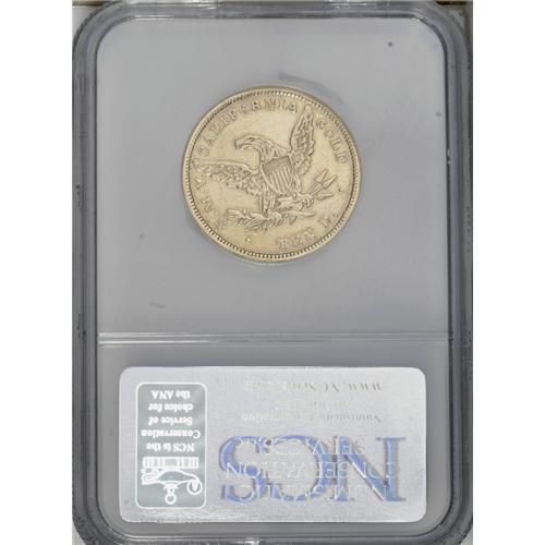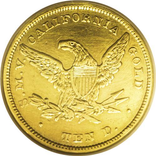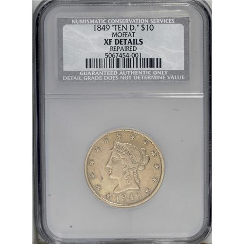 <B>1849<$10> Moffat & Co. Ten Dollar, "Ten D."--Repaired--NCS. XF Details.</B></I> K-5, R.6. The eagle is richly detailed, and the obverse shows noticeable wear only on Liberty's curls. The fields are crudely smoothed, and the thickly hairlined surfaces are artificially bright and prooflike. All 1849 Moffat ten dollar pieces are very rare, and the impairments of the present example bring it within reach of the intermediate territorial gold collector.