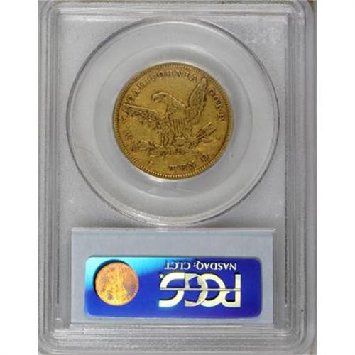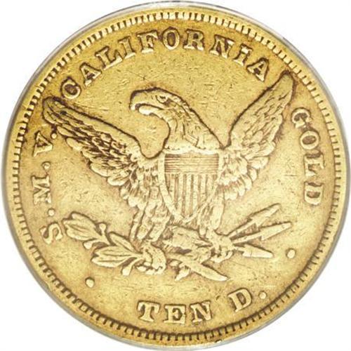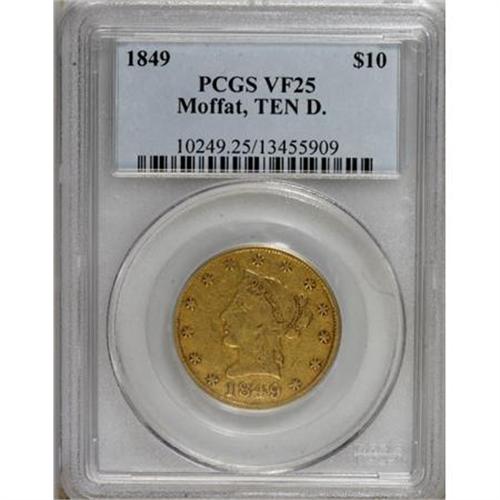 <B>1849 $10 Moffat & Co. Ten Dollar, "Ten D." VF25 PCGS.</B></I> K-5, R.5. K-5 and K-5a appear to be the same variety, with no difference seen in the size of the reverse letters. This green-gold representative has pleasing sharpness on the eagle, while the portrait shows the expected amount of wear. Only lightly abraded. Listed on page 352 of the 2008 <I>Guide Book.</B></I> Population: 5 in 25, 28 finer (7/07).<BR><BR><b>Shipping:</b> Coins & Currency (<a target="_blank" href="http://www.heritageauctions.com/common/shipping.php">view shipping information</a>)