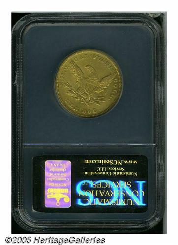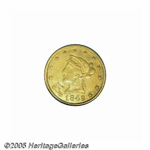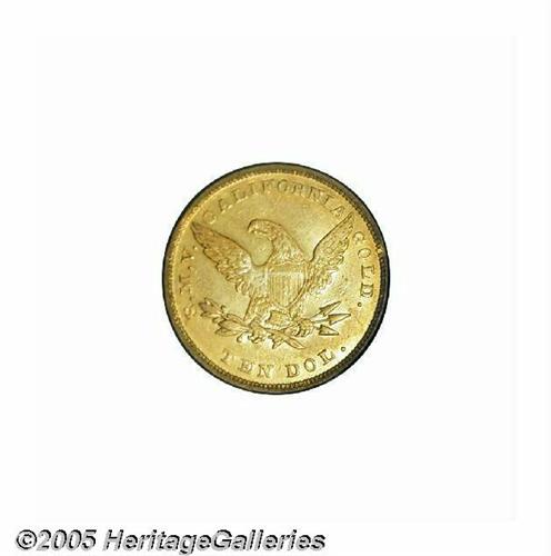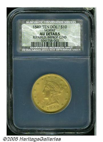<B>1849<$10> Moffat & Co. Ten Dollar, "Ten Dol." AU Details, Repaired, Improperly Cleaned, NCS.</B></I> Variant of Kagin-6a, R.6+. Middle arrow points beneath period. From different dies than the K-6a plate coin, the middle leaf is aligned with the right edge of the S in S.M.V. Study of all recent Heritage appearances of K-6a match the Kagin plate, which has the middle leaf tip aligned with the period after the S. Clearly a rare die marriage, and a subject for research by the attentive specialist. Boldly defined, but harshly cleaned, and the left obverse field is extensively tooled. Listed on page 295 of the 2005 <I>Guide Book.</B></I><BR><I>From The Great Western Collection of Territorial Gold.</B></I>