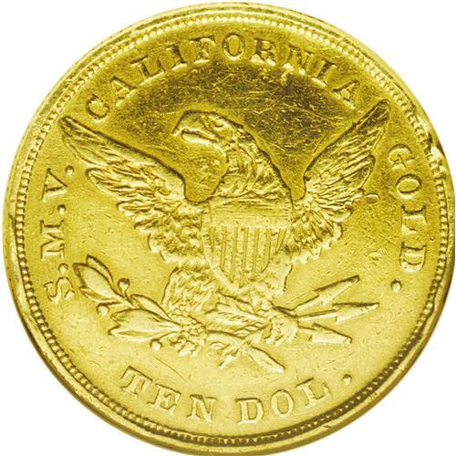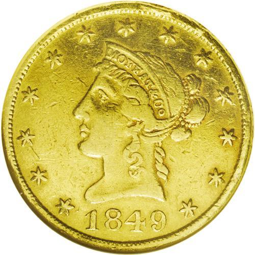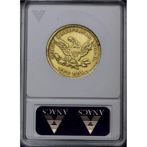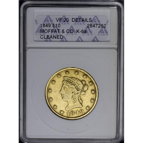<B>1849<$10> Moffat & Co. Ten Dollar, "Ten Dol."--Cleaned--ANACS. VF20 Details.</B></I> K-6a, High R.5. This bright and unnaturally prooflike piece is bluntly struck in the centers, and also exhibits wear on Liberty's tresses. The rims have distributed minor dings, and a short scratch resides beneath star 3. Listed on page 348 of the 2007 <I>Guide Book.</B></I>
