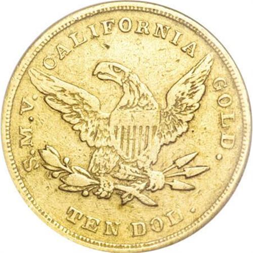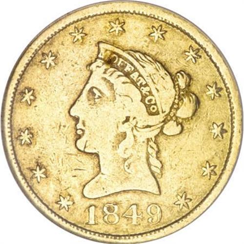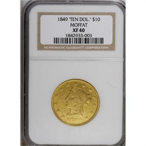 <B>1849 $10 Moffat & Co. Ten Dollar, "Ten Dol." XF40 NGC.</B></I> K-6a, High R.5. The first coins issued by the private firm of Moffat & Company were 1849-dated ten dollar gold pieces. At the time of their production, Moffat & Company was the only private minter in San Francisco besides Norris, Gregg, & Norris, and this denomination does not usually appear much finer. The present example is unusually attractive for the grade, with even overall wear and plenty of bold definition remaining in the protected areas of the design. Abrasions are moderate, and the color is a rich, original green-gold. A perfect candidate for inclusion in a circulated Territorial gold type set. Listed on page 352 of the 2008 <I>Guide Book.</B></I><BR><BR><b>Shipping:</b> Coins & Currency (<a target="_blank" href="http://www.heritageauctions.com/common/shipping.php">view shipping information</a>)
