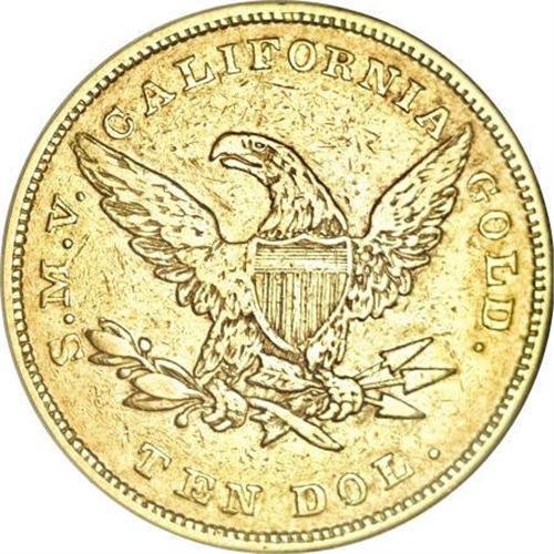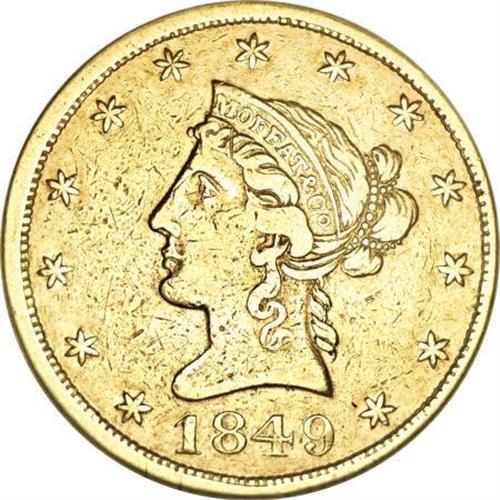 <B>1849 $10 Moffat & Co. Ten Dollar, "Ten Dol." AU50 NGC.</B></I> K-6a, High R.5. This variety is similar to K-6, but the numerals in the date are larger and, on the reverse, the middle arrow points below the period following GOLD, rather than above it. This piece shows generally good striking quality on the obverse, with typical softness on the reverse eagle. The green-gold surfaces display even highpoint wear and numerous small hits on each side. Overall, an appealing high-grade example of this rare issue. Listed on page 352 of the 2008 <I>Guide Book</B></I>. Census: 1 in 50, 5 finer (1/08). <BR><BR><b>Shipping:</b> Coins & Currency (<a target="_blank" href="http://www.heritageauctions.com/common/shipping.php">view shipping information</a>)