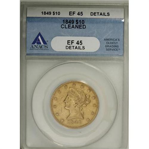 <B>1849 $10 --Cleaned--ANACS. XF45 Details.</B></I> NGC Census: (163/434). PCGS Population (66/157). Mintage: 653,618. Numismedia Wsl. Price for NGC/PCGS coin in XF45: $451. (#8601)<BR><BR><B>Coin Engraver:</B> Christian Gobrecht<BR><BR><b>Shipping:</b> Coins & Currency (<a target="_blank" href="http://www.heritageauctions.com/common/shipping.php">view shipping information</a>)
