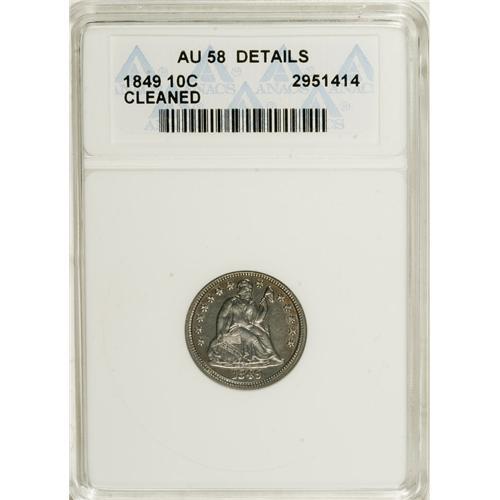 <B>1849 10C --Cleaned--ANACS. AU58 Details.</B></I> A difficult date in high grades, despite the mintage of more than 800,000 pieces. The fields are a bit shiny from the noted cleaning, but the piece is boldly struck, with just a few light, undistracting surface abrasions seen under a loupe.<BR><I>Ex: Stack's 71st Anniversary Sale (10/2006), lot 2661.</B></I><BR><BR><b>Shipping:</b> Coins & Currency (<a target="_blank" href="http://www.heritageauctions.com/common/shipping.php">view shipping information</a>)