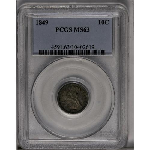 1849 10C MS63 PCGS. Soft, satin-like luster underlies
