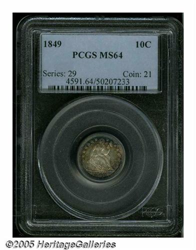 <B>1849<10C> MS64 PCGS.</B></I> The 1849 dime had a rather substantial mintage of 839,000 pieces, but very few high grade examples are known today. In MS64, PCGS has only certified three other pieces with two finer (5/05). Sharply defined, the surfaces are highly lustrous and there are a few small abrasions scattered over each side that keep the coin in the MS64 grade range.