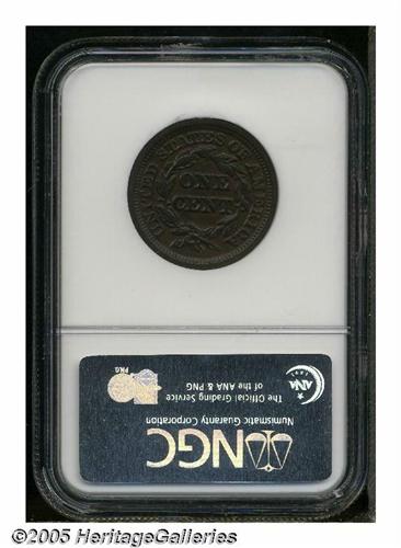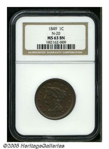 <B>1849<1C> MS63 Brown NGC.</B></I> N-20, R.1. A well struck Select Large Cent that has noticeable faded Red about the stars and legends. The devices and fields have toned in steel-brown color. A few tiny marks on the portrait, these do not begin to challenge the grade.