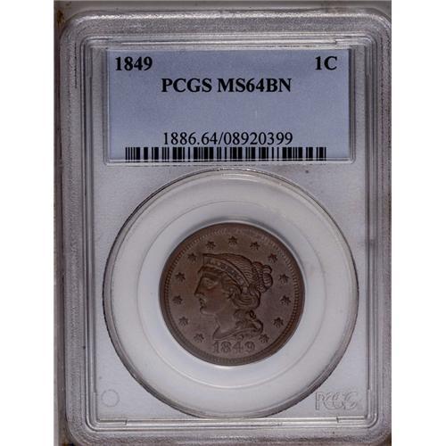 <B>1849<1C> MS64 Brown PCGS.</B></I> N-4, R.1. This splendid chocolate-brown near-Gem is satiny and smooth. The strike is meticulous, and the quality is undeniable. Population: 12 in 64 Brown, 2 finer (5/06). EAC 55.